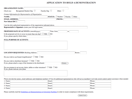 The New School respects the right of demonstrators to express their ideas in ways that do not limit the freedom of others or impinge on the rights of others.